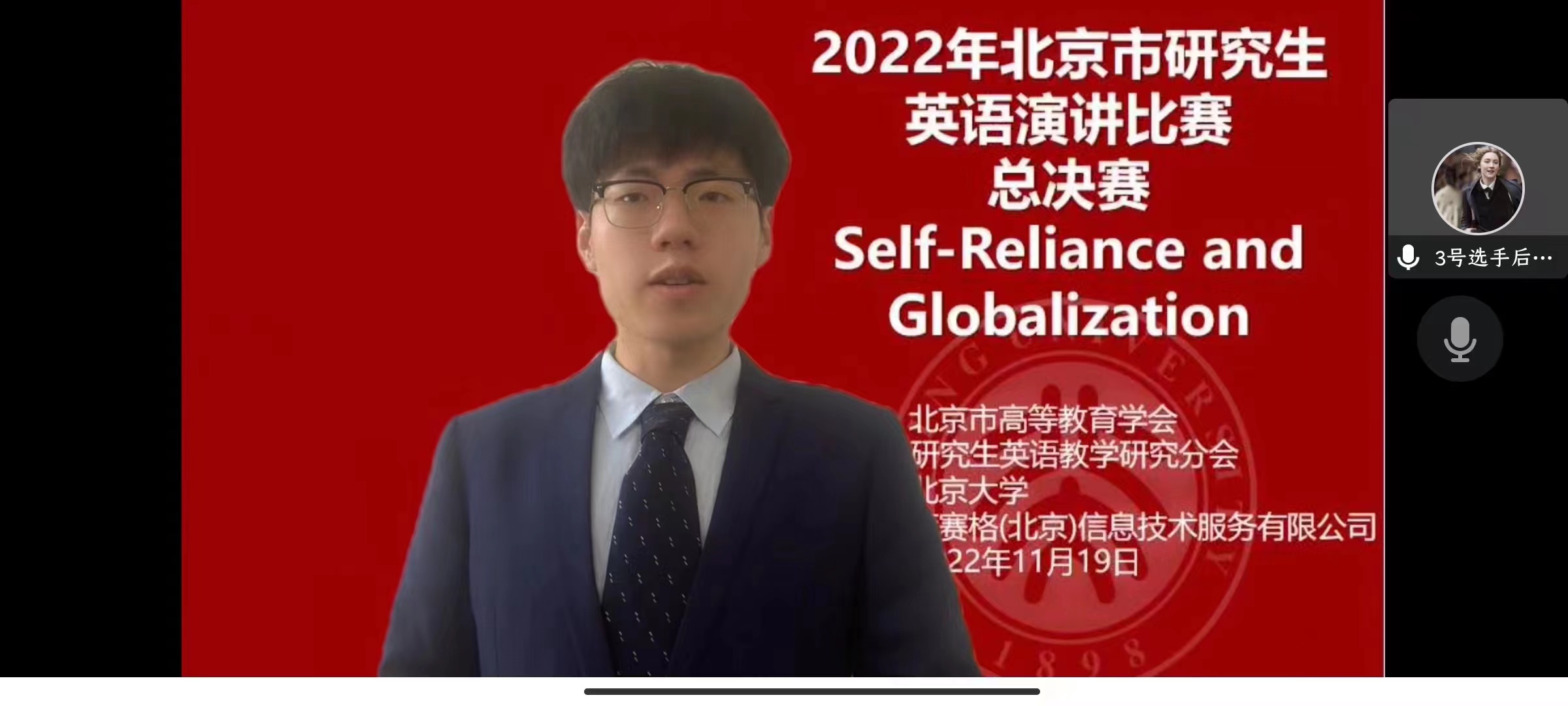 供稿:柳君丽 摄影:王玉雯、白鑫雨、鲁妍池、张铭 编辑:王喆 2022年11月19日上午,2022年北京市研究生英语演讲比赛落下帷幕。本届比赛的主题为:Self-Reliance and Globalization(自主化与全球化)。本次比赛由北京市高等教育学会研究生英语教学研究分会主办,北京大学承办,蓝赛格(北京)信息技术服务有限公司协办。经过校内初赛和决赛、北京市复赛和决赛的多轮选拔和激烈角逐,我校法学院白鑫雨同学力压群雄荣获一等奖,机电学院鲁妍池同学和外国语学院张铭同学(...